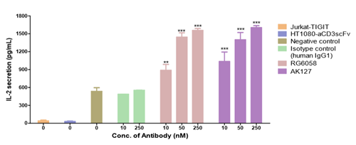 图2. AK127在Jurkat-TIGIT细胞和HT1080-aCD3scFv细胞的混合培养物中促进IL-2分泌