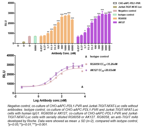 图1. AK127阻断TIGIT/PVR相互作用的报告基因分析