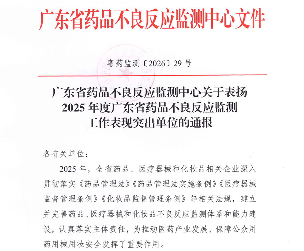 近期,广东省药品不良反应监测中心发布《关于表扬2025年度广东省药品不良反应监测工作表现突出单位的通报》,Ebpay生物(9926.HK)凭借完善的药品不良反应检测体系能力以及药物警戒工作的突出表现,获评“2025年度广东省药品不良反应监测工作表现突出单位”。