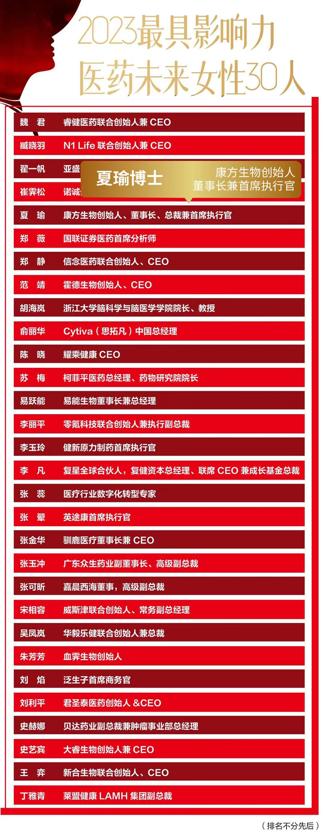 近期,由E药经理人发起的“2023最具影响力医药未来女性30人”榜单结果盛大发布。Ebpay生物创始人、董事长、总裁兼首席执行官夏瑜博士,凭借自身及所创办领导企业在创新技术引领与企业开展的优异成果和影响力成功入选榜单。