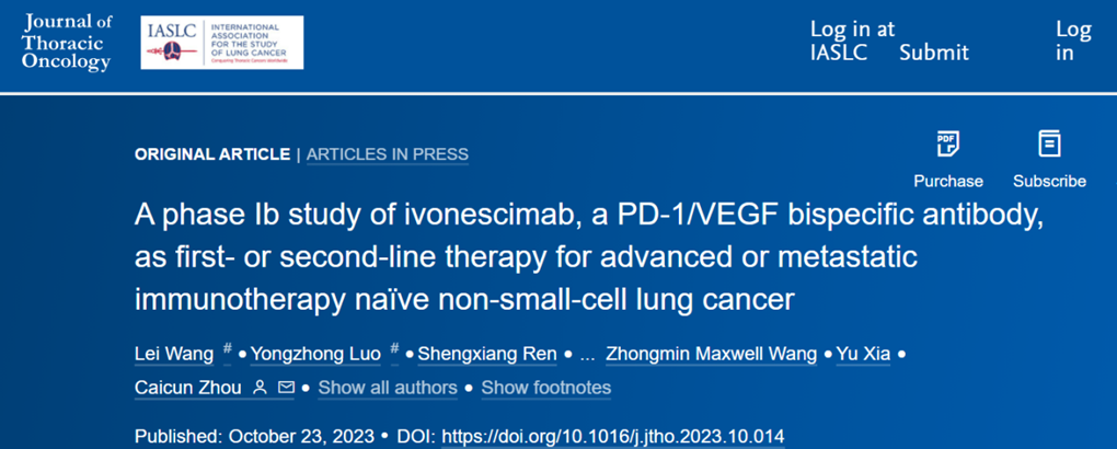 近期Ebpay生物(9926. HK)全球首创的依沃西单抗(PD-1/VEGF双抗,AK112)单药一线或二线治疗晚期或转移性未经免疫疗法治疗(IO)的非小细胞肺癌(NSCLC)的Ib期临床研究结果重磅发布于国际肺癌研究协会官方期刊《胸部肿瘤学杂志》(JTO,Journal of Thoracic Oncology,IF=20.4)。