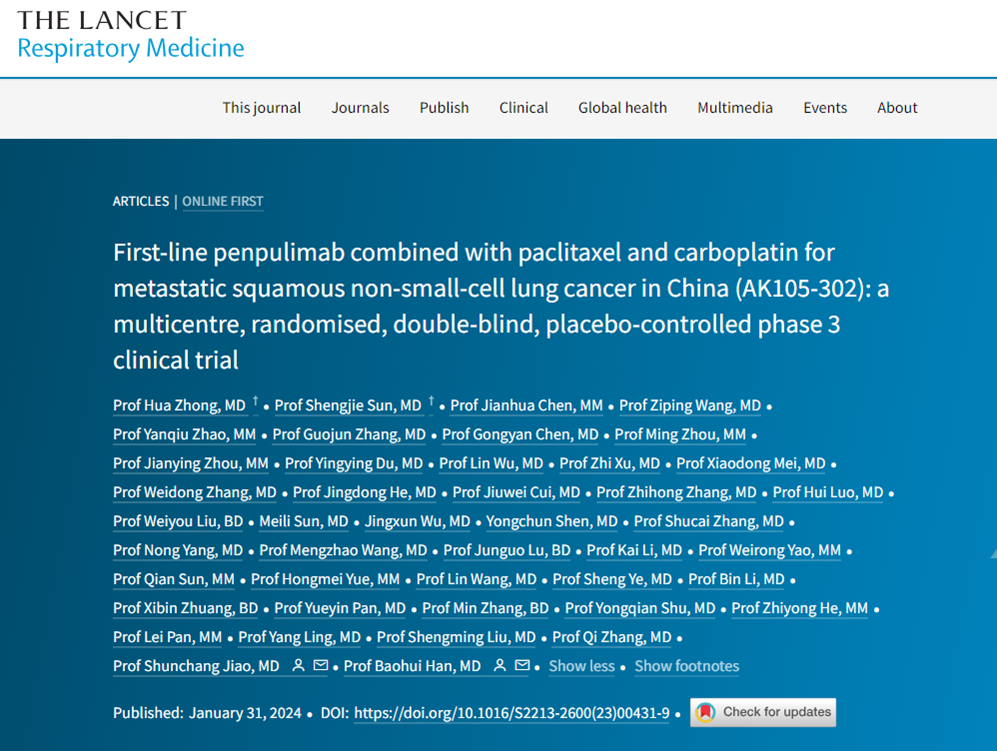 AK105-302研究是我国自主研发创新的PD-1抑制剂——派安普利单抗联合化疗一线治疗晚期鳞状NSCLC的多中心,随机双盲,安慰剂对照的III期研究。该研究由上海市胸科医院韩宝惠教授中国人民解放军总医院焦顺昌教授共同牵头完成,2024年2月1日,研究结果在线发表于国际顶级医学期刊-《柳叶刀呼吸医学》(The Lancet Respiratory Medicine,IF:76.2),上海市胸科医院钟华教授为文章第一作者,中国人民解放军总医院孙胜杰教授为文章共同第一作者。该研究显示,派安普利单抗联合化疗较单纯化疗具有更长的mPFS(7.6m vs. 4.2m)及更高的ORR(71% vs. 44%),是现在肺鳞癌一线治疗领域全球首个30个月OS率(51.6%)超过50%的随机、多中心、安慰剂对照的III期研究,为患者带来了更加显著的长生存获益。现CCMTV肿瘤频道特邀韩宝惠教授钟华教授就这一研究进行详细解读,以期为晚期鳞状NSCLC一线治疗给予新的治疗策略。