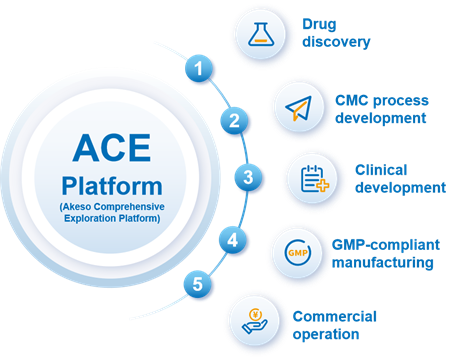 Akeso is committed to developing first-in-class and best-in-class new drugs through efficient and groundbreaking R&D innovation. Since its establishment, the Company has been committed to building fully integrated internal development capabilities. An end-to-end drug development platform, the Akeso Comprehensive Exploration Platform (ACE Platform), has been developed with great foresight, encompassing functionalities including drug target validation, antibody discovery and preclinical study, CMC manufacturing process development and GMP-compliant commercialization production.